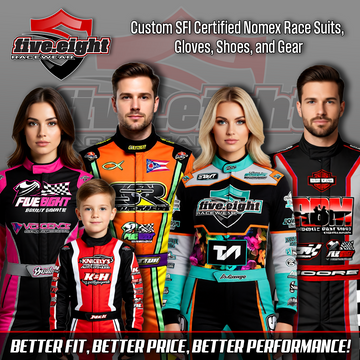 Five Eight custom race suits are designed, fitted, and built specifically for you, combining safety, comfort, and standout design. From local short tracks to national series, our suits are made to perform under pressure and look sharp doing it.