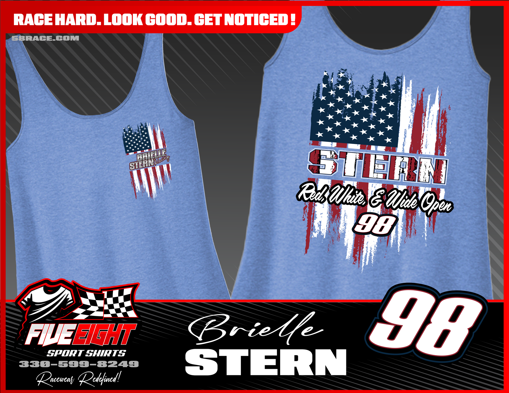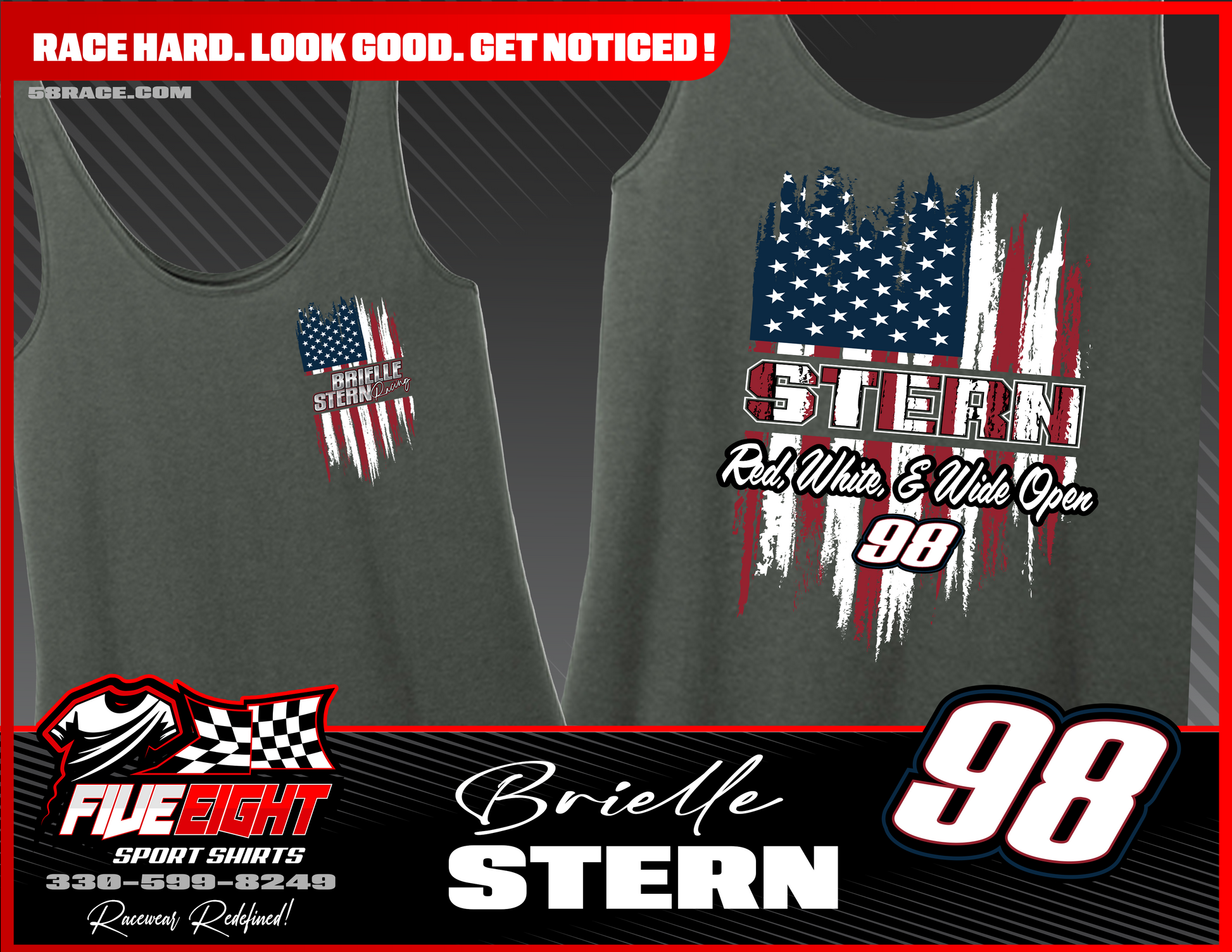 Show off your American pride and dirt track passion with the Brielle Stern #98 "Red, White, & Wide Open" tank top. This bold design features a distressed U.S. flag graphic blended with racing attitude—perfect for July 4th weekends, trackside nights, and every red, white, and Wide Open moment in between.